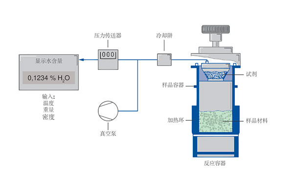 水和氫化鈣在氫發(fā)展過程中根據(jù)以下反應(yīng)方程式相互反應(yīng):CaH2+2H2O→Ca(OH)2+2H2 該反應(yīng)發(fā)生在 AQUATRAC-V 中的一個封閉容器,即反應(yīng)容器中。使用內(nèi)置真空泵在測量前將其排空,并在測量期間對其進行電加熱。加熱釋放的水蒸氣與氫化鈣反應(yīng),由于氫的生成,測量系統(tǒng)中的壓力增加。氣體壓力與引入的水量成正比,因為反應(yīng)是針對水的。氣體壓力是該方法的測量變量。計算壓力與樣品重量之比,結(jié)果以% ppm 和mg水含量表示。其他揮發(fā)性物質(zhì)在室溫下被冷凝在冷卻阱中,因此不參與測量。因此,這是一種專門用于水的絕對測量方法——如 DIN EN ISO 15512:2019 中所述,即方法E——用氫化鈣法測定水含量。