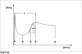 該軟件能夠分析曲線(xiàn),并確定在轉(zhuǎn)矩曲線(xiàn)(用于測(cè)量粘度)、熱融合時(shí)間、凝膠速度和機(jī)械能輸入這三者中的極值。