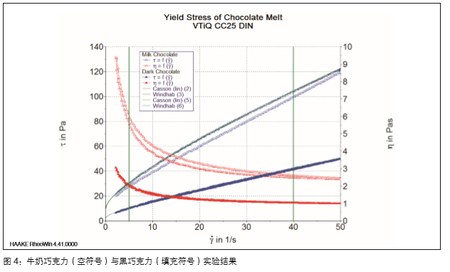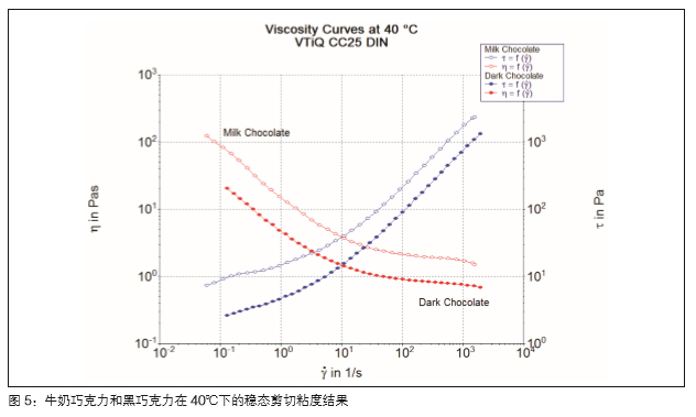當(dāng)圓筒轉(zhuǎn)子的上部到達(dá)測量位置后,樣品保持一個 靜止的狀態(tài)。在這個時間里,任何由于加樣或者或 者夾具閉合帶來的外力作用都會得到松弛,同時樣 品也會到達(dá)測試溫度。程序的最后(步驟11-13) 是數(shù)據(jù)評估部分,由RheoWinTM 軟件自動進(jìn)行。 通過傳統(tǒng)的卡松模型或者Windhab 模型[3] 可以來 計算巧克力融體的屈服應(yīng)力. 而 Servais [4] 提供了 一個更為簡便的方法,就是用剪切速率為5s-1 下 的剪切應(yīng)力作為其屈服應(yīng)力。如果采用這種方法, RheoWinTM 軟件也可以自動進(jìn)行插值計算。 同樣,本報告中也給出了兩種樣品在 40℃下的穩(wěn)態(tài) 剪切實(shí)驗(yàn)結(jié)果。相對于瞬時粘度數(shù)據(jù),穩(wěn)態(tài)剪切粘 度不取決于時間依賴效應(yīng)或者剪切速率變化斜率。