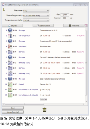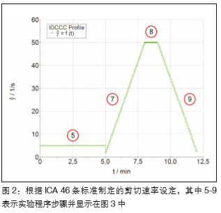按照 ICA 第 46 條標(biāo)準(zhǔn)制備了兩種巧克力樣品,一種是牛 奶巧克力,另一種是黑巧克力。將兩種樣品切成片,放 進(jìn)密封的玻璃容器中,然后將玻璃容器在 52℃的爐子中 放置45-60 分鐘。同時,將測量杯和轉(zhuǎn)子在Viscotester iQ 的帕爾貼溫控單元中預(yù)加熱到 40℃。 這個實(shí)驗(yàn)中采用的測量夾具為CC25 DIN Ti(直徑 25mm 鈦合金同軸圓筒). 這個小尺寸同軸圓筒體系只 需要 16.1 毫升的樣品,而且可以很容易的拆卸及清理。 測試方法按照ICA 第 46 條標(biāo)準(zhǔn)轉(zhuǎn)換成賽默飛 TM 哈克 TM RheoWinTM軟件的標(biāo)準(zhǔn)程序。剪切速率范圍見圖2所示。 哈克 TM RheoWinTM 程序(圖 3)包三部分內(nèi)容:樣品條 件,測試及評估。樣品條件應(yīng)該始終保留在程序序列中, 以防止忘記并保證所有測試都按此條件進(jìn)行從而保證測 試結(jié)果的重復(fù)性。在測試條件這一部分中(步驟 1-4),