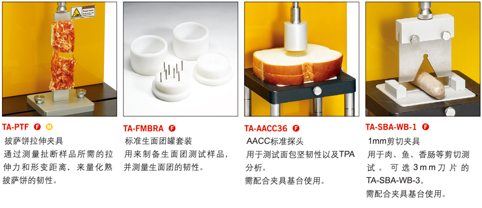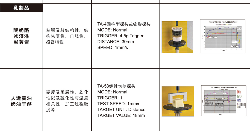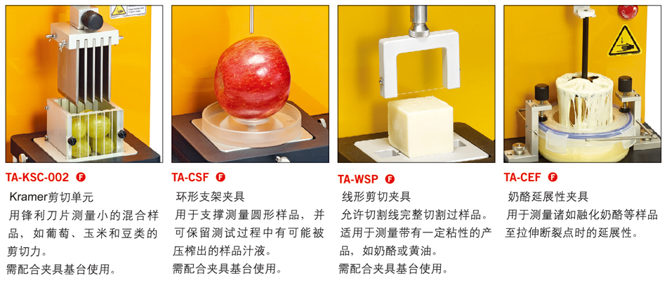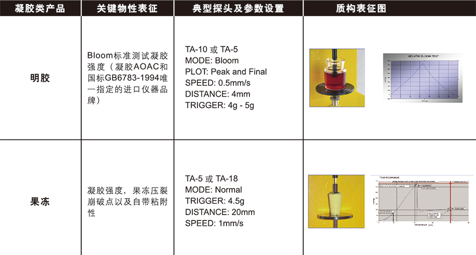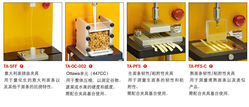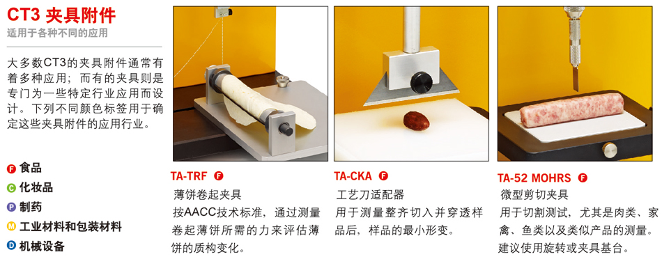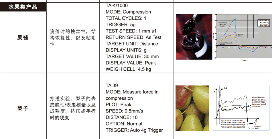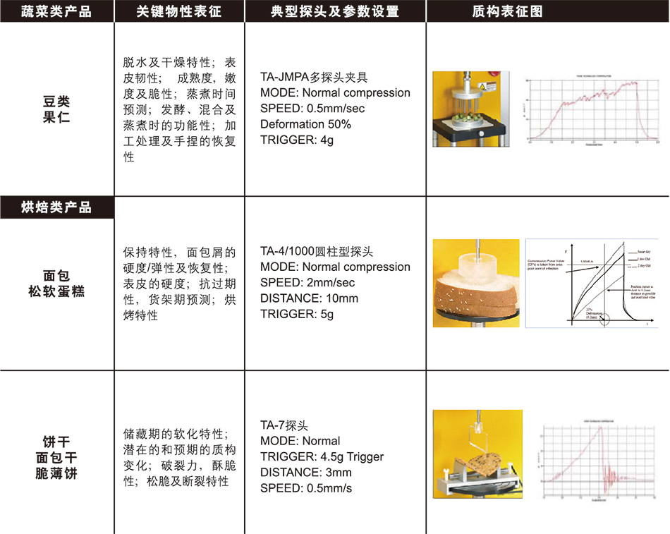可應(yīng)用于肉制品、糧油食品、面食、谷物、糖果、果蔬、凝膠果醬等食品的物性學(xué)分析;可以分析食品的嫩度、硬度、脆性、粘性、彈性、內(nèi)聚性、咀嚼性拉伸強度、抗壓強度、穿透強度等各項物性指標(biāo)。還可用于個人護理品、膠類(明膠/果膠等)藥品膠囊、民用和工業(yè)粘結(jié)材料(膠粘劑樹脂)等行業(yè)