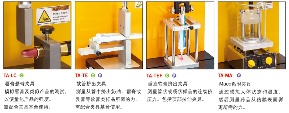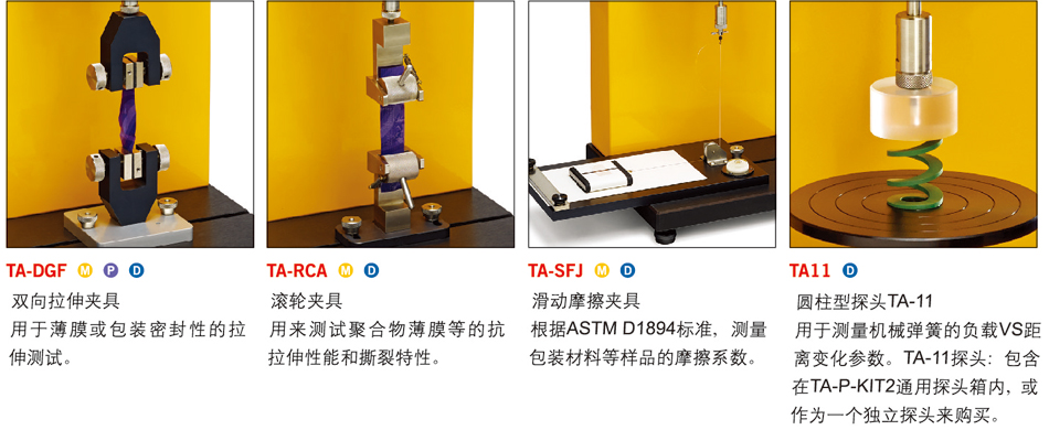 樣品在質(zhì)構(gòu)分析過程中,選擇探頭的幾何形狀十分關(guān)鍵。一個大 角度的圓錐探頭比小角度的圓錐探頭需要用更大的力來驅(qū)動;同 樣,用大直徑的圓柱型探頭比用小圓柱型探頭需要用更大的力 探頭夾具的選擇會直接影響測試結(jié)果。