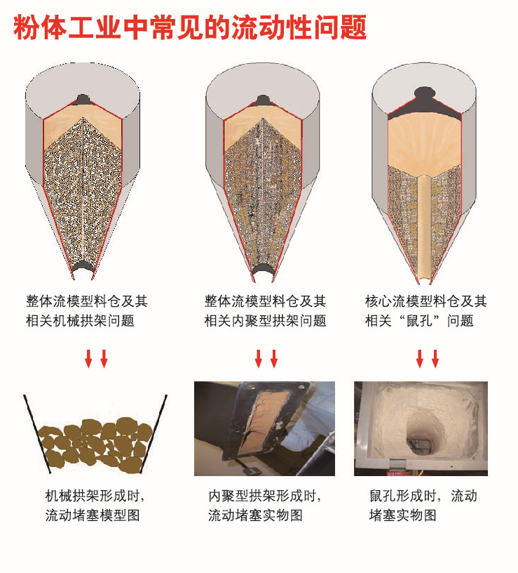 粉體在整個(gè)流程工藝中會(huì)遇到許多影響流動(dòng)性的因素,如儲(chǔ)存、運(yùn)輸及在筒倉(cāng)中受到的外力影響;流出料槽時(shí)在底部漏口形成的拱架結(jié)構(gòu);核心流動(dòng)型容器,先進(jìn)后出流出方法帶來(lái)的“鼠孔”問(wèn)題一周邊阻塞中間流動(dòng);在擠岀或管流中遇到的流動(dòng)不暢等。AMETEK BROOKFIELD現(xiàn)代的粉體測(cè)試方法可以針對(duì)不同的問(wèn)題,對(duì)每種工藝情況進(jìn)行流動(dòng)性評(píng)估以確保粉體在整個(gè)流程中不會(huì)遇到阻塞問(wèn)題