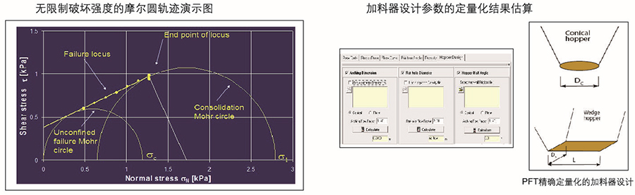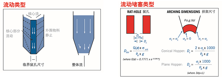 臨界拱架尺寸是整體流行為中粉體在料斗出口處可能形成穩(wěn)定的機(jī)械拱架從而阻礙流動(dòng)的一種保守計(jì)算。以上的拱架值表明料斗開(kāi)口必須大于480mm(18.9in),以確保所有粉體均能穩(wěn)定流動(dòng)。2號(hào)樣品的臨界拱架尺寸比其他三種粉體的要大得多,這是由于它具有非常粘結(jié)的特性,從而更具有形成穩(wěn)定拱架的趨勢(shì)。這個(gè)計(jì)算也適用于直接輸送物料進(jìn)料斗的任何運(yùn)送設(shè)備,如螺旋供料器上凹槽的距離。