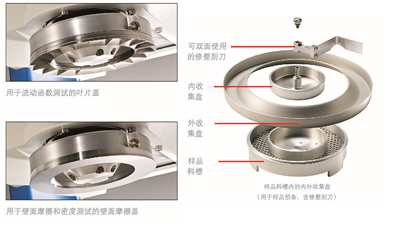 壁面摩擦蓋,軟鋼2228RA或Tvar88或特別訂購(gòu),溫度探針,濕度傳感器,篩網(wǎng)套裝標(biāo)準(zhǔn)體積或小型體積,粉體流動(dòng)演示套裝