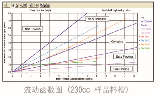 該流動(dòng)函數(shù)圖說(shuō)明了在不同固結(jié)壓力下樣品的流動(dòng)能力。X軸參數(shù)為固結(jié)壓力,用來(lái)擠壓樣品;Y軸參數(shù)為粉體強(qiáng)度。2號(hào)樣品(藍(lán)色線(xiàn))是全部樣品中內(nèi)聚力最大的物料,在整個(gè)固結(jié)壓力過(guò)程中均落在非常粘結(jié)( very cohesive)區(qū)間。3號(hào)樣品(橙色線(xiàn))也落在了該非常粘結(jié)( very cohesive)區(qū)間。4號(hào)樣品(綠色線(xiàn))在低固結(jié)壓力(1.5kPa以下)時(shí),非常粘結(jié)( very cohesive);中固結(jié)壓力時(shí)(1.5-4.5kPa),則為粘結(jié)( cohesive);而在高固結(jié)壓力(4.5kPa以上)時(shí),則容易流動(dòng)( easy flowing)。1號(hào)樣品(紅色線(xiàn))在固結(jié)壓力為0-4.0kPa時(shí),表現(xiàn)為粘結(jié)( cohesive),然后在固結(jié)壓力4kPa以上時(shí),表現(xiàn)為容易流動(dòng)( easy flowing)。2號(hào)樣品清晰表明了一個(gè)切實(shí)的流動(dòng)行為是多么的困難。