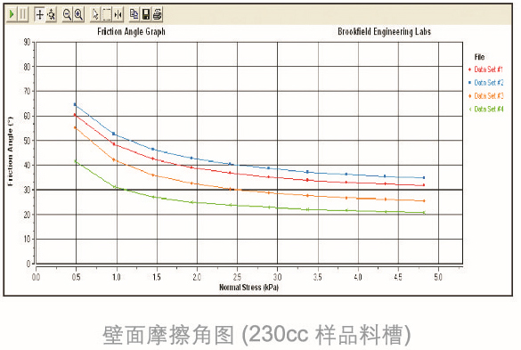 該圖說(shuō)明了不同強(qiáng)度的法向應(yīng)力下的內(nèi)部摩擦角。內(nèi)部摩擦角是物料彼此滑落時(shí)粉體顆粒之間的一個(gè)摩擦測(cè)量。1號(hào)樣品和4號(hào)樣品有著最低的內(nèi)部摩擦角,因此比其他兩個(gè)樣品更容易流動(dòng)。2號(hào)樣品和3號(hào)樣品的內(nèi)部摩擦角相對(duì)較高,大約為50°,從而預(yù)示著可能會(huì)有潛在的流動(dòng)堵塞問(wèn)題。