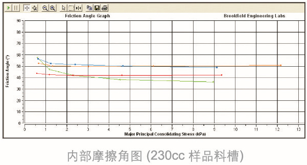 該圖說(shuō)明了每種粉體在不同固結(jié)壓力下的壁面摩擦角。在低法向應(yīng)力(0.5kPa)下,所有樣品都有極高的壁面摩擦角,范圍在40°~65°。在較高的法向應(yīng)力(4.75kPa)時(shí),壁面摩擦角跌至20°-35°。壁面摩擦角高于30°時(shí),可認(rèn)為非常高;而低于0°則非常小。這表明了2號(hào)樣品在該料斗壁面極難流動(dòng),而且1號(hào)樣品也可能如此。