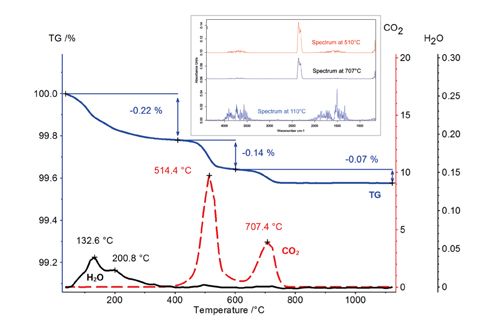 熱重曲線顯示了多個失重步驟。在 400°C 以前,幾個失重步驟均有較小的重疊,接下來的兩個失重臺階分離的很好,其 DTG 峰值溫度分別為 510°C 與 705°C。樣品至1100°C的總失重量為 0.43%。紅外譜圖顯示水和二氧化碳為主要的氣體產(chǎn)物。