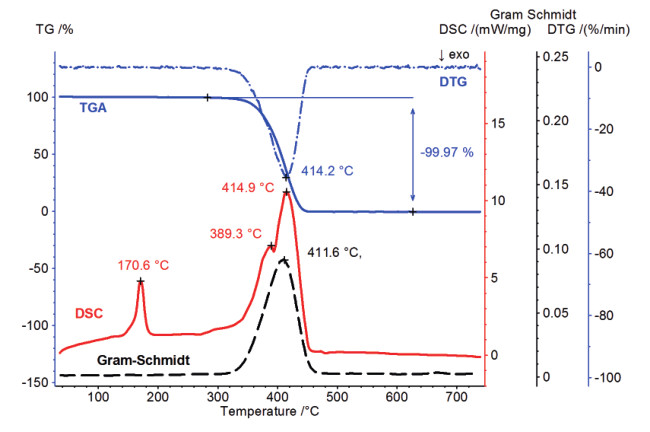 上圖中,藍色實線為熱重曲線,藍色虛線為 DTG 曲線,紅色為 DSC 曲線,黑色虛線為 FT-IR 曲線(Gram-Schmidt圖)。