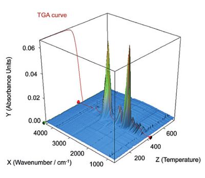 三維的紅外譜圖包含了溫度坐標(biāo)(Z 軸)與 TGA 曲線,為樣品的熱裂解分析提供了另一個有力的證據(jù)。