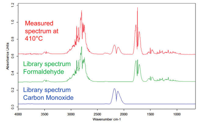 為確定逸出氣體的成分,從三維譜圖中提取出 410℃ 下的二維譜圖(紅色),與紅外數(shù)據(jù)庫中的標(biāo)準(zhǔn)譜圖進行比對,比對結(jié)果表明氣體成分為甲醛(綠色標(biāo)準(zhǔn)譜圖)和 CO(藍色標(biāo)準(zhǔn)譜圖)。