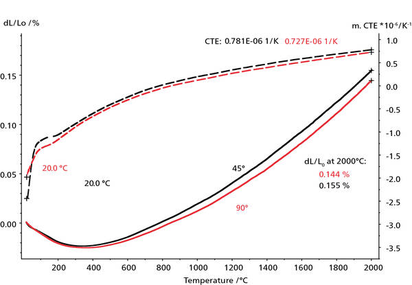 C/C 材料的熱膨脹系數(shù)取決于其纖維結(jié)構(gòu)。本例中,測(cè)試了 45 度纖維方向(黑線)和0度纖維方向(紅線),兩條曲線都展現(xiàn)出纖維增強(qiáng)復(fù)合材料的特征行為:在 300-400°C 附近達(dá)到最小尺寸,隨后膨脹。