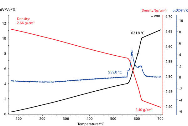 圖示為體積膨脹曲線(黑色實(shí)線),計(jì)算所得密度曲線(紅色實(shí)線),c-DTA曲線(藍(lán)色虛線)