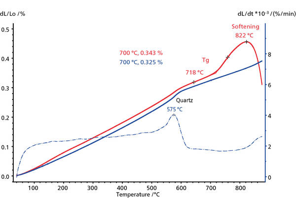 釉料與基體之間的匹配性差是造成開(kāi)裂(蛛網(wǎng)式的裂縫布滿釉面)的主要原因。導(dǎo)致這種現(xiàn)象產(chǎn)生的重要原因之一是釉料與基體的熱膨脹不匹配。為了防止開(kāi)裂,釉料的熱膨脹系數(shù)必須小于基體。下圖顯示的是基體(藍(lán)色曲線)與釉料(紅色曲線)熱膨脹行為的對(duì)比圖,在 700°C(略低于釉料的玻璃化轉(zhuǎn)變溫度 718°C)時(shí)兩者膨脹系數(shù)之間的差異為 0.02%。釉料的軟化發(fā)生在 822°C。由于釉的膨脹系數(shù)較高,將導(dǎo)致在冷卻過(guò)程中產(chǎn)生與膨脹成比例的不必要的張應(yīng)力。