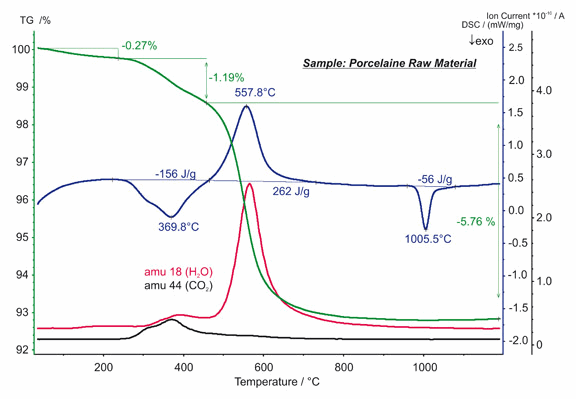 對(duì)陶瓷原材料的 STA 測(cè)試顯示了三個(gè)失重臺(tái)階。在約 250°C 以下,為吸附水的揮發(fā)。在 250°C 至 450°C 之間,觀察到了有機(jī)組分的燒失,釋放了 156 J/g 的能量。高嶺土的脫水發(fā)生在 450°C 以上,吸熱熱焓為 262 J/g。質(zhì)譜曲線上的 18 與 44 質(zhì)量數(shù)對(duì)應(yīng)于 H2O 與 CO2 的逸出。1006°C 的 DSC 放熱峰(熱焓 -56 J/g)是由于固相轉(zhuǎn)變所致。