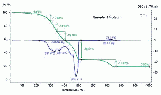 油氈作為一種建筑材料發(fā)明于1863年,常用于樓面覆蓋,具有堅(jiān)固、絕緣等特點(diǎn)。通過(guò)STA在空氣氣氛下的測(cè)試,可揭示油氈的自然組成。150°C之前是水分的揮發(fā),隨后的 200°C 至500°C 之間多步的失重主要是亞麻子油、天然樹(shù)脂、軟木屑、木屑和黃麻襯底等的燒失,伴隨著較大的放熱效應(yīng),在該氧化過(guò)程中釋放的熱量達(dá) 14.5KJ/g。在 600°C…750°C 之間,主要是填充物 CaCO3 的熱分解。