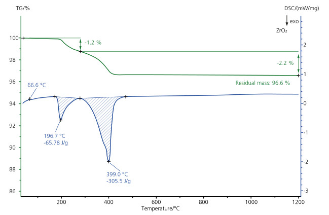 下圖顯示了室溫至 1000℃ 溫度范圍內(nèi),CaC2O4-H2O 的 TGA 與 DSC 曲線。第一階段失重臺(tái)階為脫水過(guò)程,樣品脫水之后轉(zhuǎn)變?yōu)闊o(wú)水草酸鈣(CaC2O4)。第二階段失重臺(tái)階是由 CO 的釋放所致,代表了從草酸鈣向碳酸鈣(CaCO3)的轉(zhuǎn)變。在 700℃ 以上,碳酸鈣分解,釋放 CO2 ;殘余質(zhì)量為氧化鈣(CaO)。實(shí)驗(yàn)測(cè)量到的失重量與理論值非常吻合(偏差 < 1%)。這證明了 STA 449 F5 Jupiter® 熱天平擁有很高的測(cè)量準(zhǔn)確性。