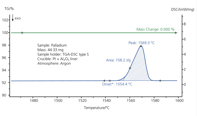 鈀(Pd)在今天的最大的用途是作為催化轉(zhuǎn)換器。此外,它也常被用于牙科、飛機(jī)火花塞、手術(shù)器械、電接觸材料等其他領(lǐng)域。鈀在室溫下與氧無(wú)反應(yīng),但當(dāng)在空氣氣氛下加熱至 800°C 時(shí),將生成一層非常薄的鈀(II)氧化物(PdO)。此圖顯示了在 STA 上進(jìn)行的 Pd 的測(cè)量,最高溫度 1600°C。藍(lán)色的 DSC 曲線顯示了熔融過(guò)程,熱焓 158 J/g,熔融起始點(diǎn) 1554°C。這兩個(gè)值均與純 Pd 的理論值非常接近,偏差 < 1%。綠色的 TG 曲線顯示,在熔融前后未發(fā)生失重;這證明了金屬的高純度,以及系統(tǒng)的真空密閉性。